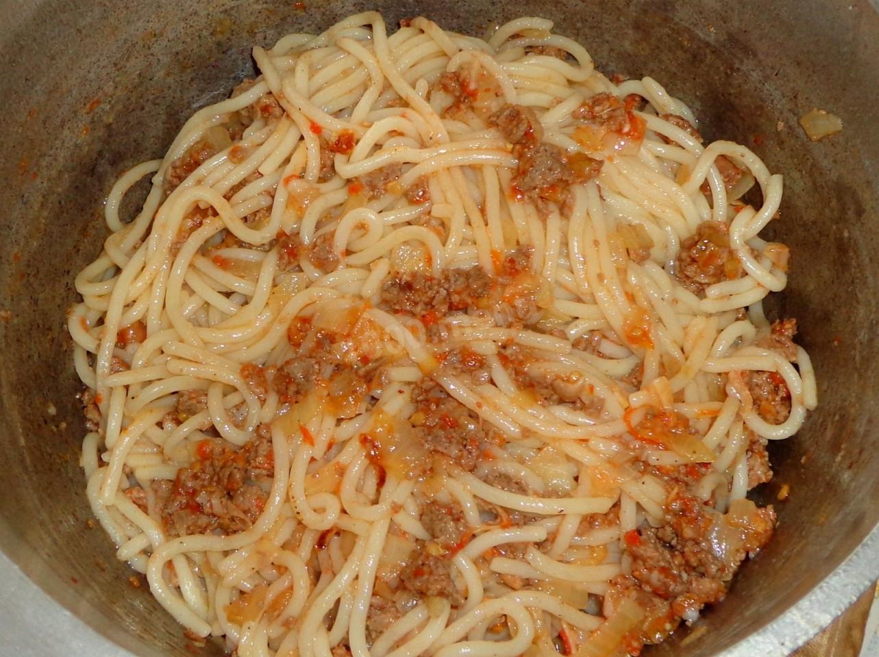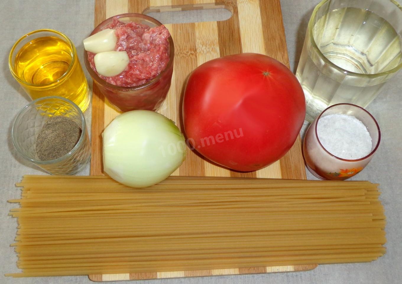 Для измельчения свежего томата понадобится обычная терка или блендер. Можно добавлять томатную пасту, либо кетчуп. Отварные спагетти соединяются с зажаркой из фарша и помидора. Фарш можно брать любой мясной или из курицы.