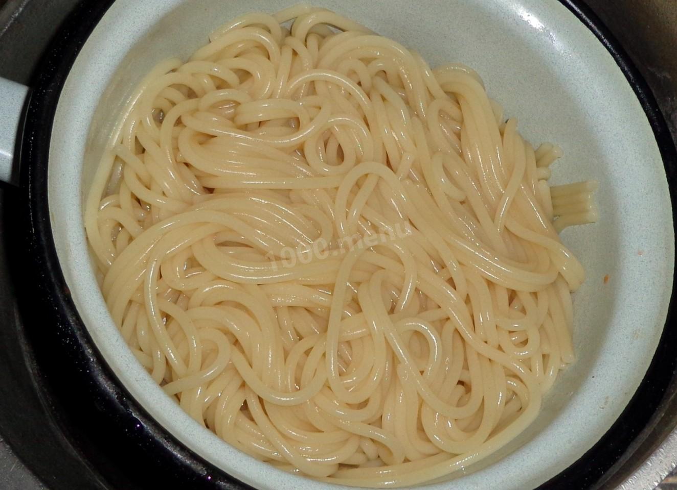 3.Спагетти вылить в дуршлаг, оставить на пару минут. Затем высыпать их обратно в кастрюлю.