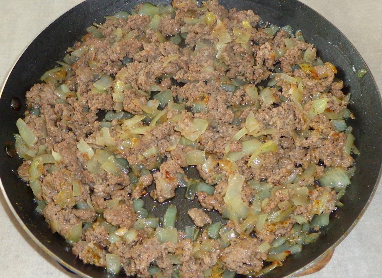 5.Затем добавить к полусырому луку мясной фарш, насыпать черный перец и соль по вкусу. Жарить под закрытой крышкой около 5-7 минут.