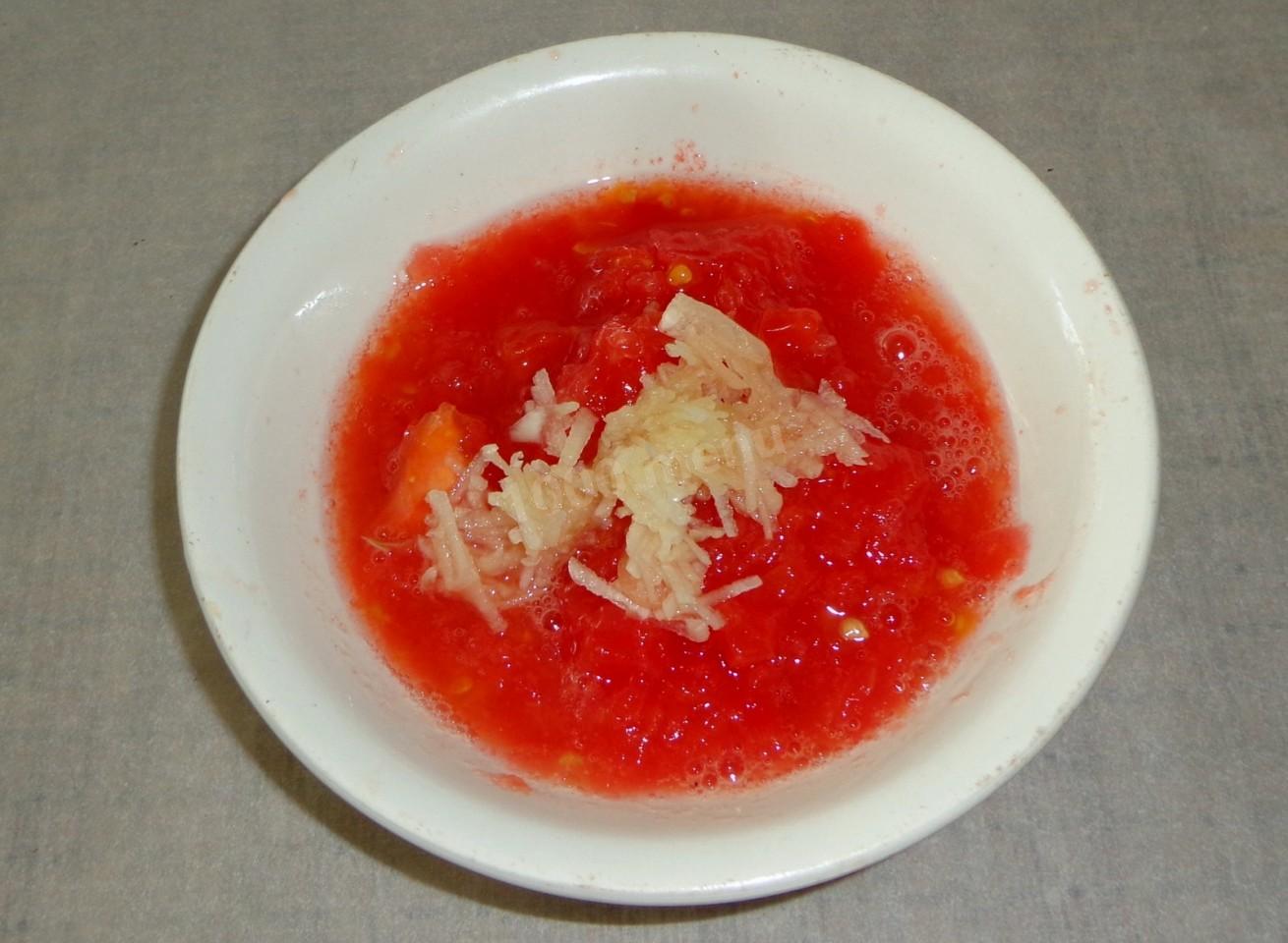 6.Помидор промыть водой, вырезать плодоножку и очистить от шкурки. Мякоть измельчить с помощью крупной терки. Зубчики очищенного чеснока потереть на мелкой терке.