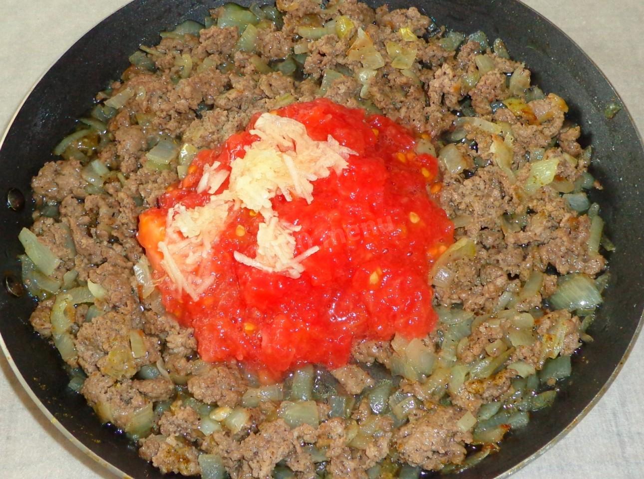 7.Томатное пюре с чесноком добавить к фаршу. Перемешать, жарить под крышкой около 7 минут. Затем прожарить на среднем огне без крышки 3 минуты, чтобы испарилась влага.