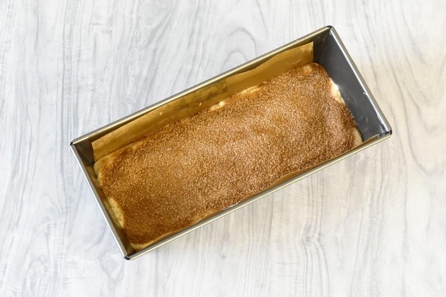 Для начала форму для кекса (26×11 см) застелите пергаментом и смажьте его маслом. Выложите в форму треть теста и разровняйте. Сверху равномерно распределите половину сахара с корицей. Накройте второй частью теста и посыпьте его оставшейся сахарно-коричной смесью. Сверху выложите оставшееся тесто и разровняйте.