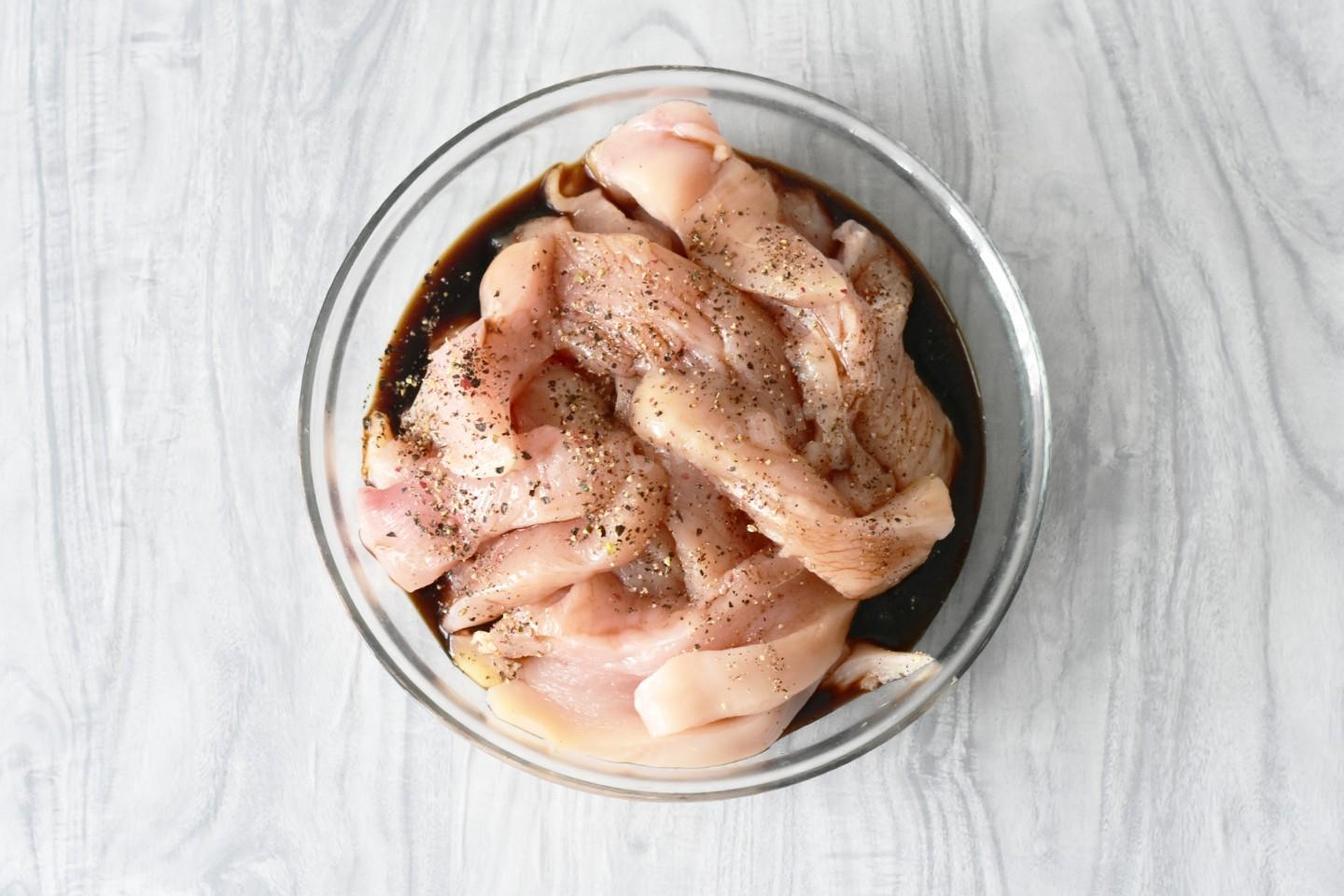 Куриное филе вымойте в холодной проточной воде, обсушите бумажным полотенцем и нарежьте вдоль длинными полосками. Полоски можете делать тонкие или потолще. Чем тоньше заготовки, тем быстрее они пропекутся. Выложите филе в миску, залейте соевым соусом, поперчите и перемешайте. Оставьте мариноваться на 30 минут при комнатной температуре.