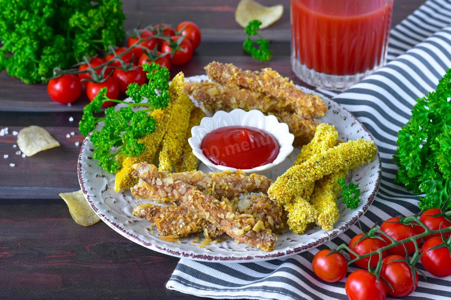 Куриные стрипсы стали настолько популярны, что во многих ресторанах их подают не только как закуску, но и как основное блюдо с гарнирами.