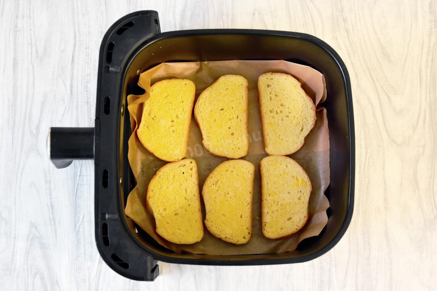 Хлеб выложите в чашу аэрогриля на застеленную силиконизированным пергаментом решетку. Можете выложить прямо на смазанную маслом решетку без пергамента. Выпекайте тосты при 180℃ около 5 минут или дольше до румяной корочки. Затем хлеб переверните на другую сторону и выпекайте еще около 5 минут. Точное время и температура зависят от вашей техники. Подробнее об этом читайте в конце рецепта. Там же найдёте полезную статью о том, как выбрать пергамент.