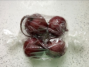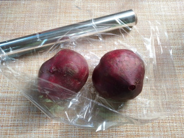 Хорошо помойте свеклу под проточной водой. Лучше воспользоваться щеткой, чтобы смыть всю грязь. Затем также тщательно обсушите каждый корнеплод, чтобы лишняя влага не мешала запеканию. Оторвите от фольги кусок чуть длиннее квадрата. Если фольга тонкая, то отмерьте двойную длину и согните кусок пополам — тогда она не порвется. Положите свеклу в центр квадрата и плотно оберните фольгой, поднимая края к центру — тогда из этого "мешочка" не будет вытекать сок.