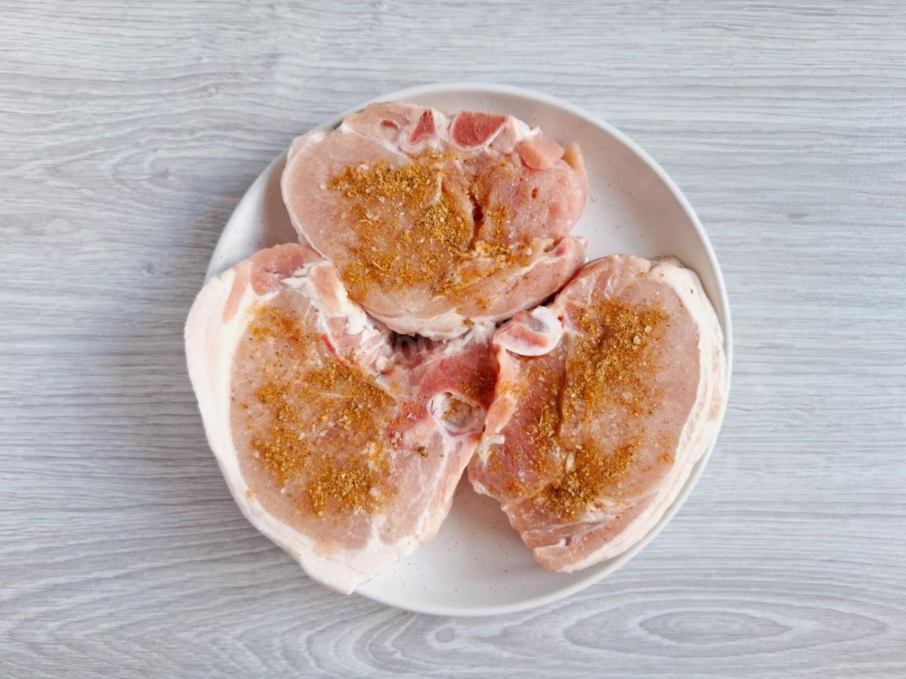 Подготовленные ломти мяса вымойте и обсушите бумажными полотенцами. Если не любите мясо на кости, можете срезать кость. Мясо посолите по вкусу и натрите специями с обеих сторон.