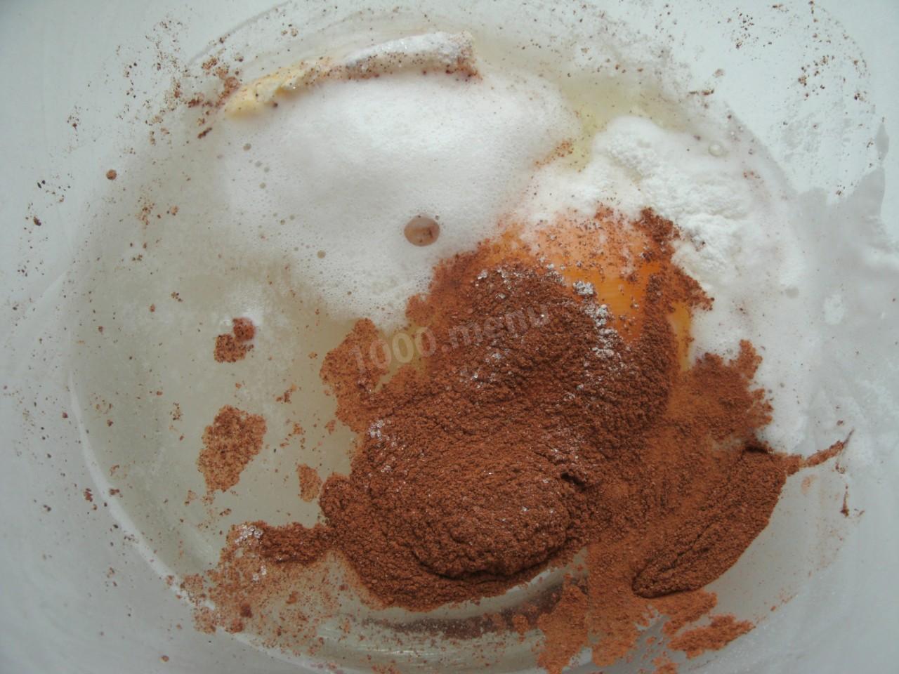 Смешайте яйцо, соль, сахар, воду, масло, корицу, разрыхлитель вместе.