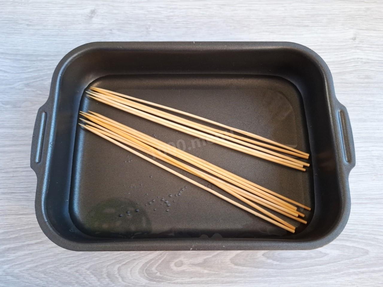 Шпажки заранее замочите в холодной воде примерно на 30 минут. Это нужно для того, чтобы деревянные шпажки не обуглилась. Также можно использовать тонкие металлические шпажки.