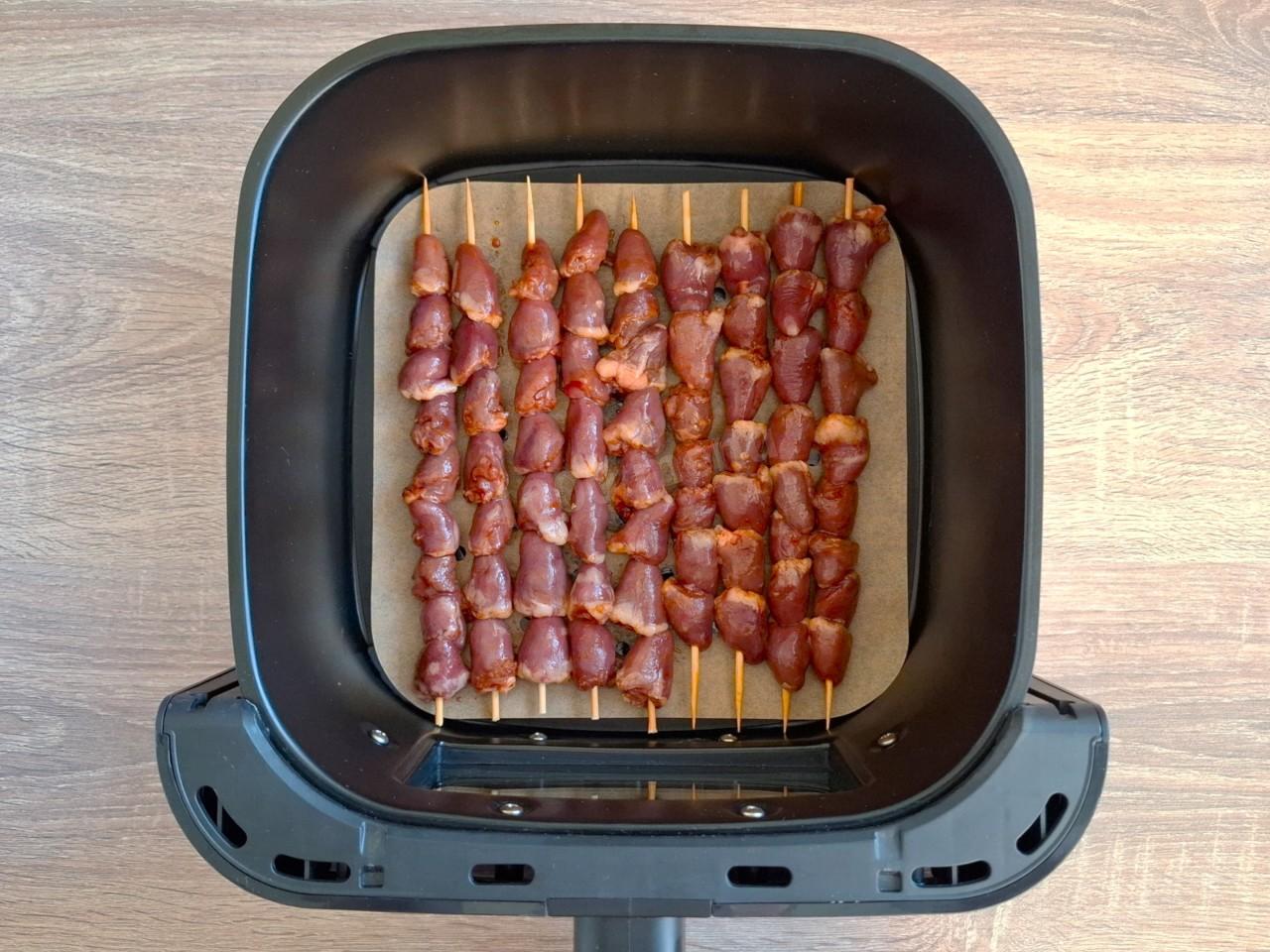 Замаринованные куриные сердечки плотно нанижите на шпажки. Выложите шашлычки в чашу аэрогриля, застеленную пергаментом. Запекать также можно в силиконовой форме, на листе фольги или на решетке, смазанной растительным маслом. С выбором пергамента поможет статья по ссылке в конце рецепта.