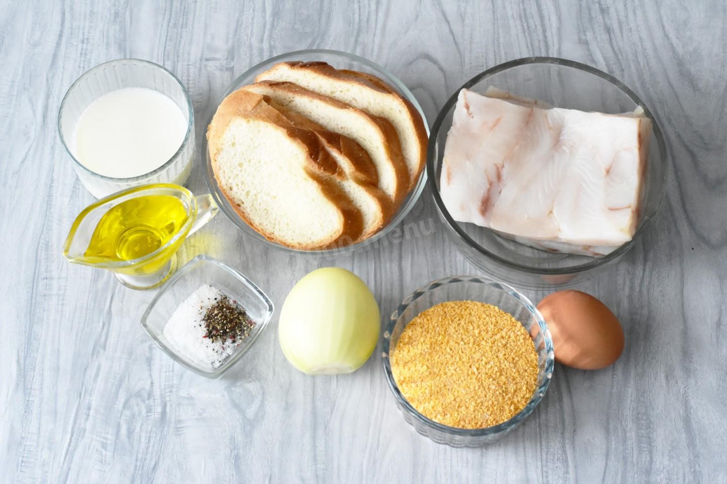 Для начала подготовьте необходимые ингредиенты по списку. Можете готовить такие котлеты из любой белой или красной рыбы, свежей или замороженной. Замороженную рыбу нужно предварительно разморозить на нижней полке холодильника. У меня замороженное филе трески в брикетах.