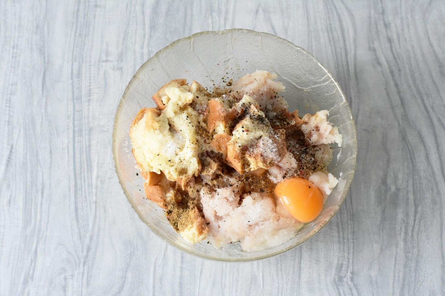 В миске соедините рыбный фарш, замоченный в молоке хлеб, лук, яйцо, соль и перец. Все тщательно вымесите до однородности. Подробнее о секретах приготовления хорошего рыбного фарша и подходящих к нему специях читайте в статье по ссылке в конце рецепта.