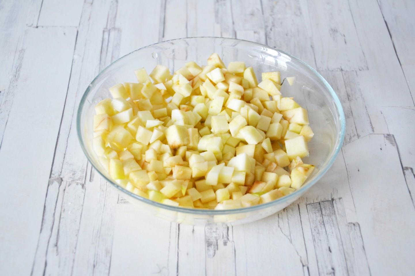 Яблоки вымыть, обсушить. Очистить от кожуры и семян и нарезать маленькими кубиками.