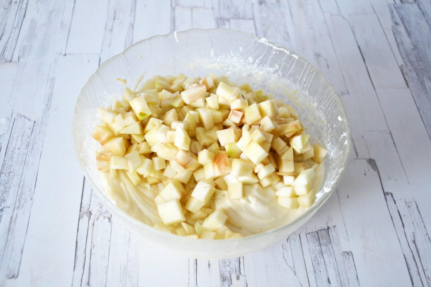 Добавить нарезанные яблоки в тесто и перемешать, чтобы фрукты равномерно разошлись по тесту.