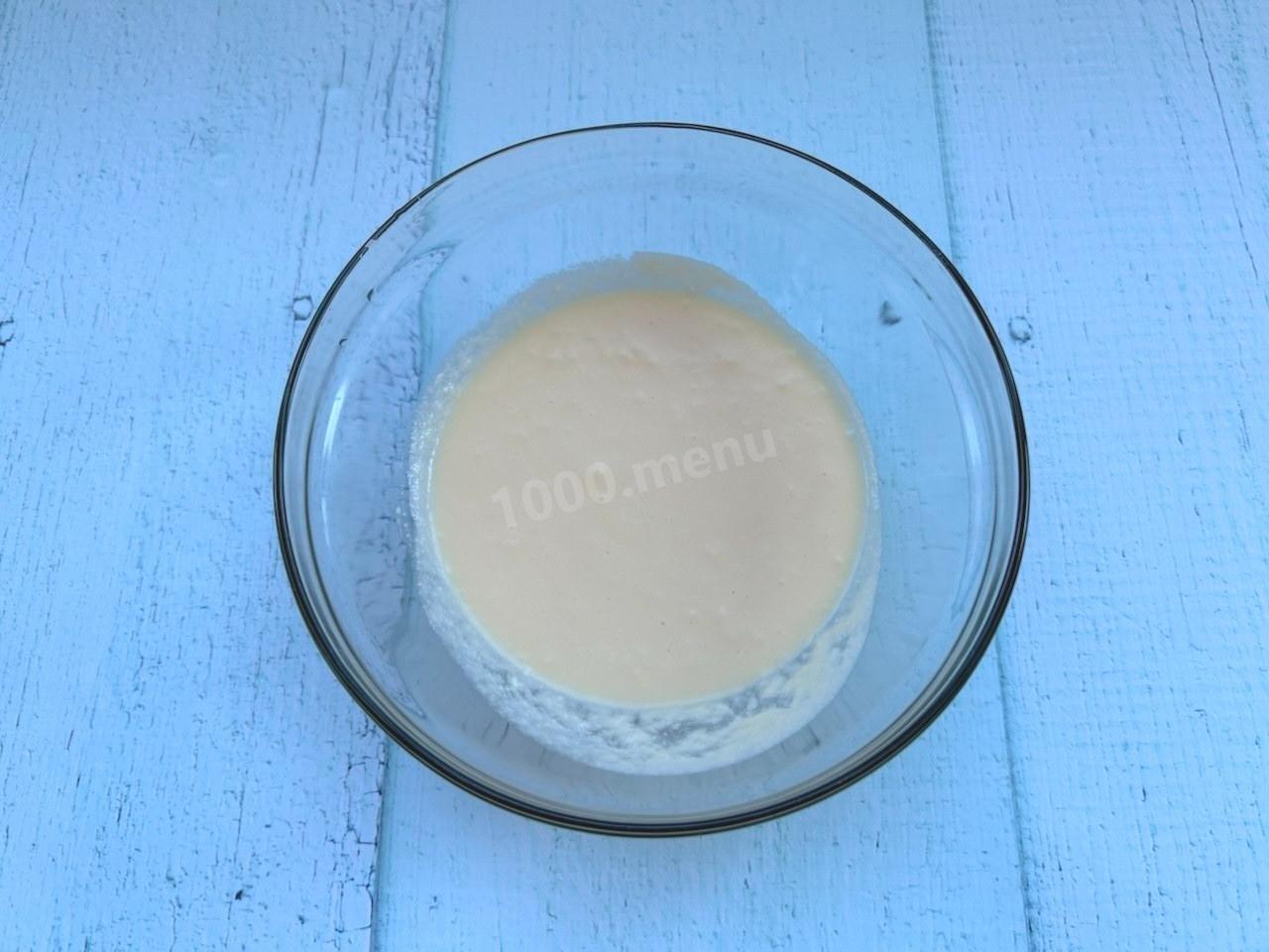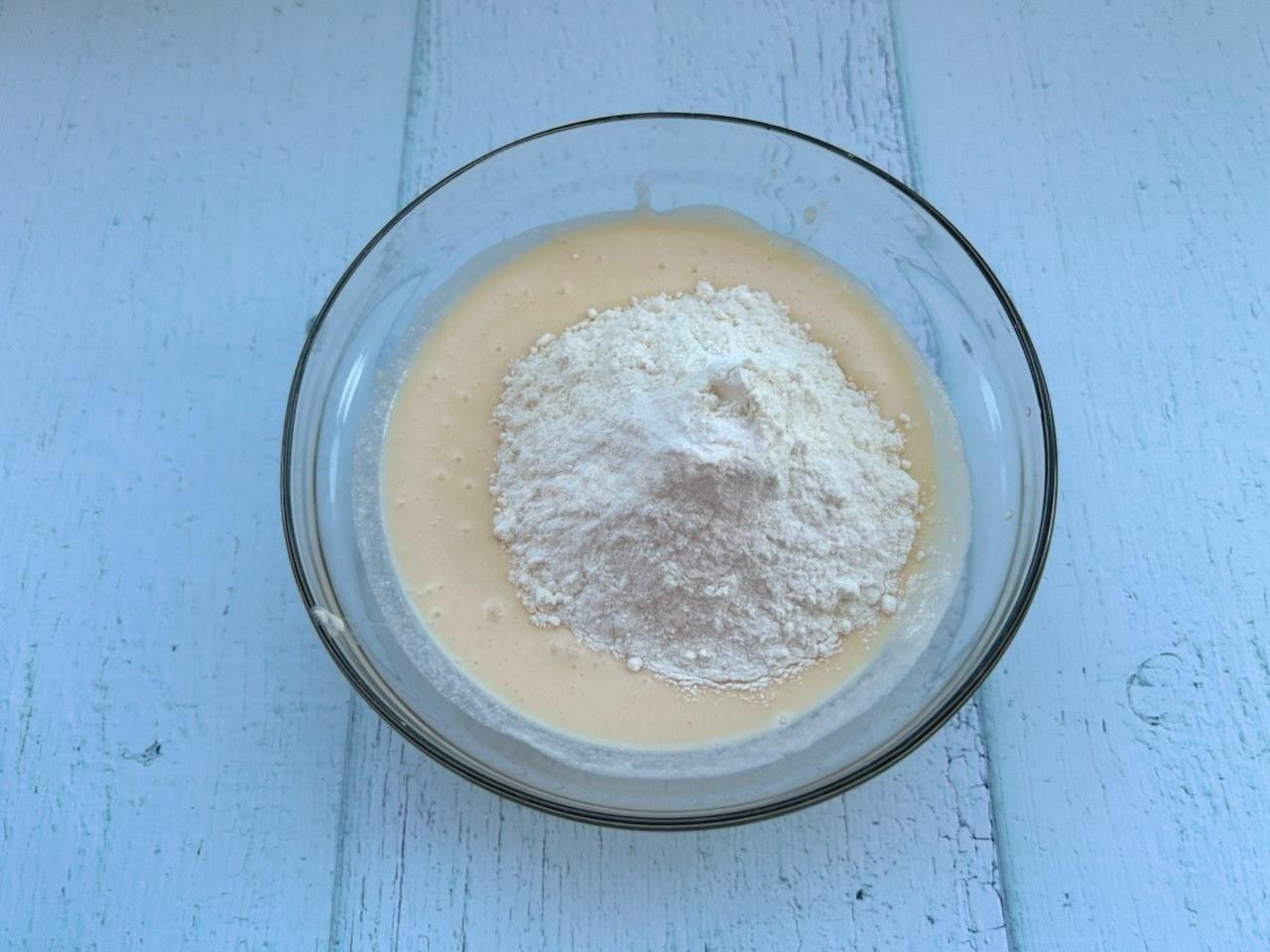 К взбитым со сливочным маслом яйцам добавьте сгущенное молоко и хорошо перемешайте лопаткой. Затем влейте молоко, ещё раз перемешайте. О замене обычного молока альтернативными вариантами читайте под шагами. К жидким ингредиентам добавьте просеянную с разрыхлителем пшеничную муку. Муку добавляйте порционно, регулируя густоту теста.