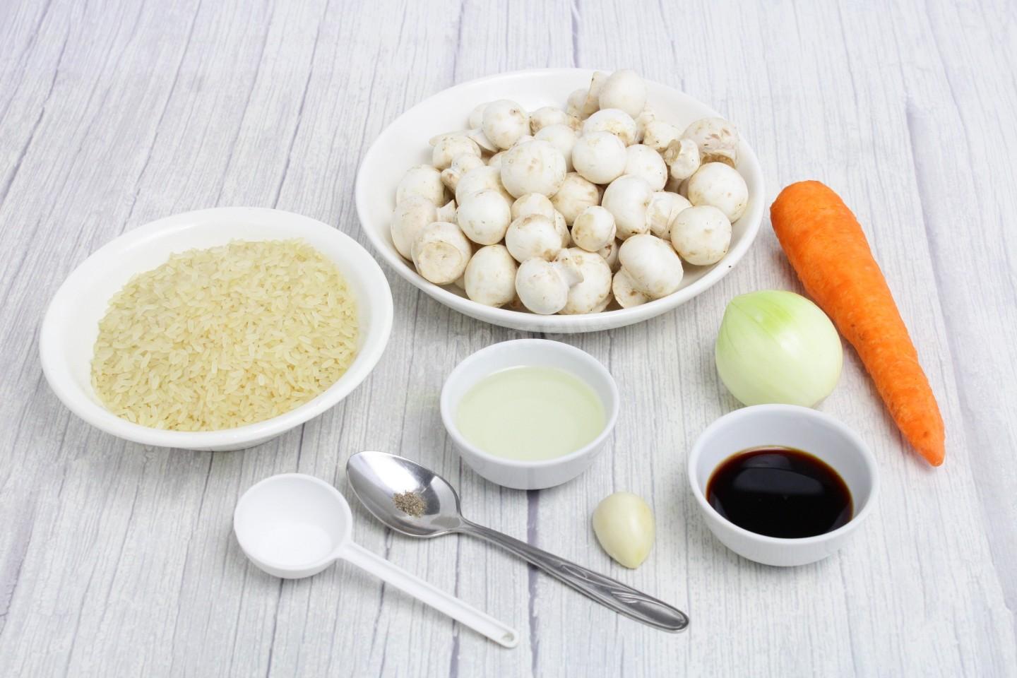 Подготовьте необходимые продукты. Можно использовать шампиньоны или любые лесные грибы. Лесные грибы необходимо предварительно отварить. В этом случае учитывайте разницу в последовательности и времени приготовления. Как подготовить шампиньоны, читайте после рецепта в статье по ссылке. Растительное масло возьмите без запаха. Рис выбирайте пропаренный. О сортах риса подробнее читайте в конце рецепта.