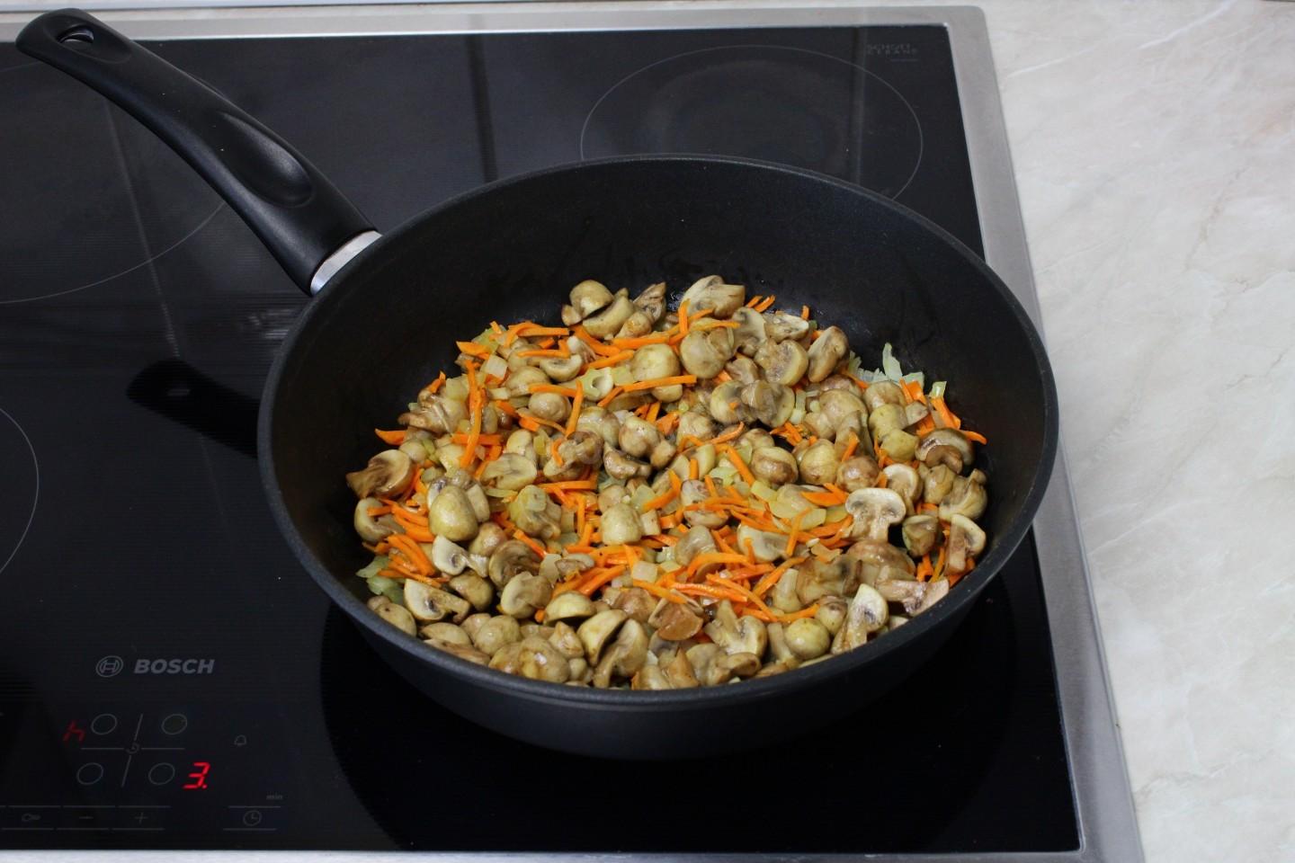 На сковороде с добавлением растительного масла обжарьте лук, морковь и чеснок на среднем огне, периодически помешивая, примерно 4-5 минут. Выбрать сковороду, масло для жарки и определиться с температурой обжаривания поможет статья по ссылке в конце рецепта. Немного увеличьте нагрев, выложите в сковороду шампиньоны и обжарьте грибы с овощами около 7-8 минут.