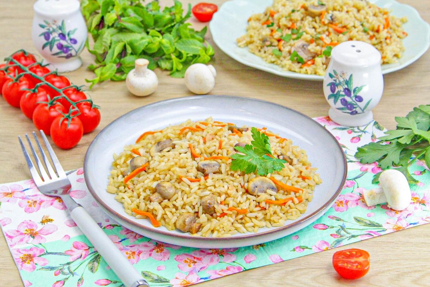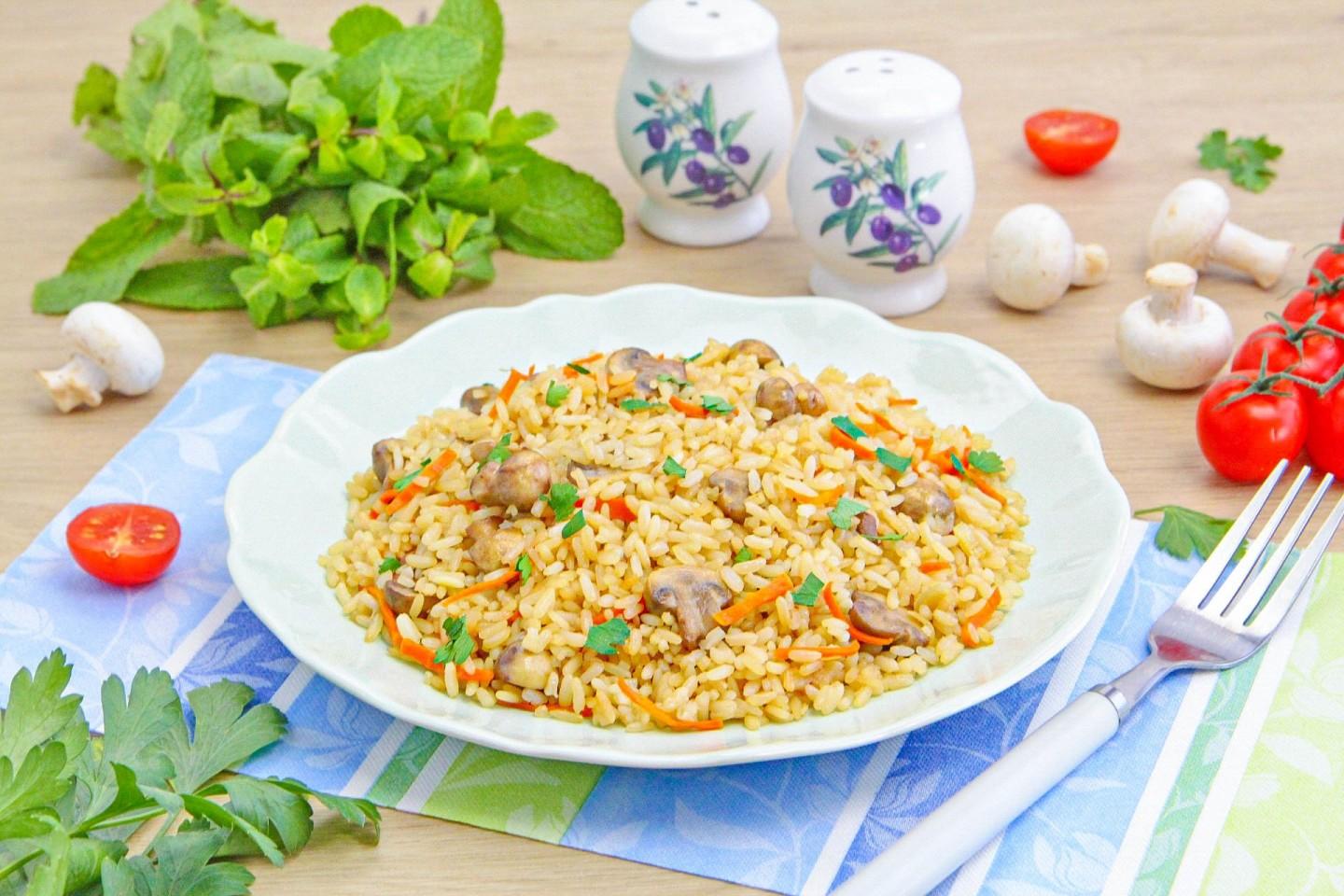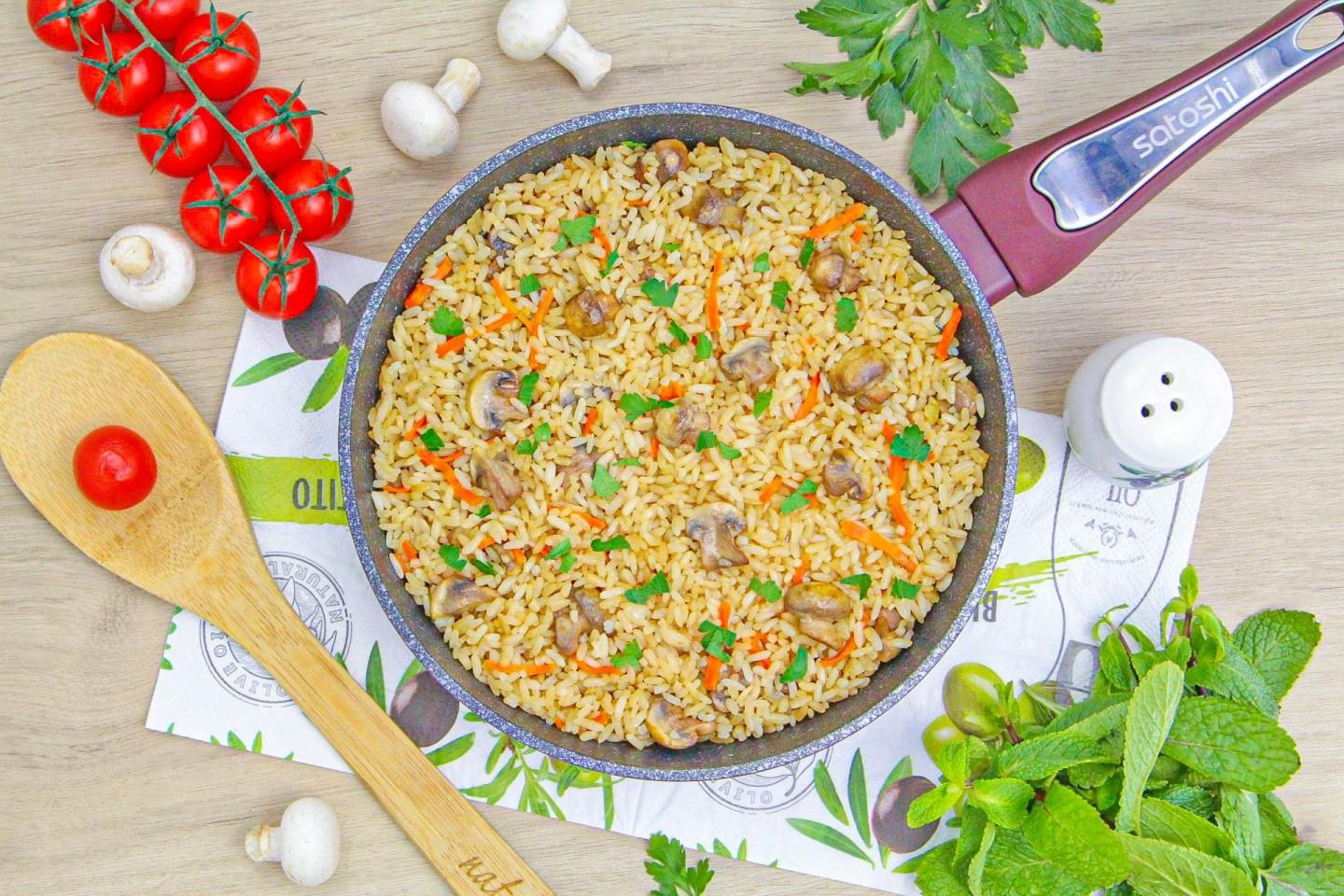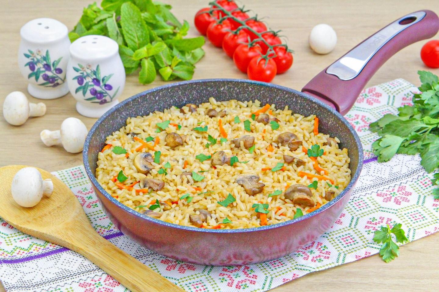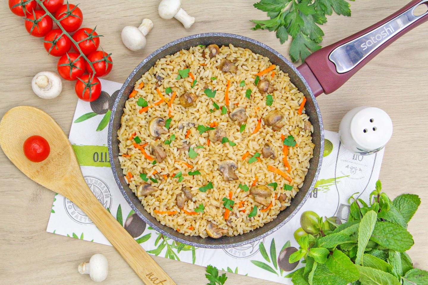 Приготовленный на сковороде рис с грибами — это сбалансированное блюдо. Пропаренный рис является источником сложных углеводов, дающих долгую энергию. Шампиньоны богаты белком и селеном, а морковь с луком — витаминами и клетчаткой. Использование растительного масла и соевого соуса делает рецепт подходящим для вегетарианского рациона.