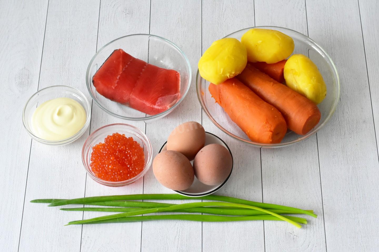 Для начала подготовьте необходимые ингредиенты. Овощи тщательно вымойте в проточной воде с помощью щетки или жесткой мочалки. Майонез можно сделать самостоятельно. Рецепты домашнего майонеза вы найдёте после последнего шага. Какую красную рыбу лучше выбрать для блюда? Подойдёт любая. Это может быть слабосоленая или копченая форель, семга, нерка и т.д.