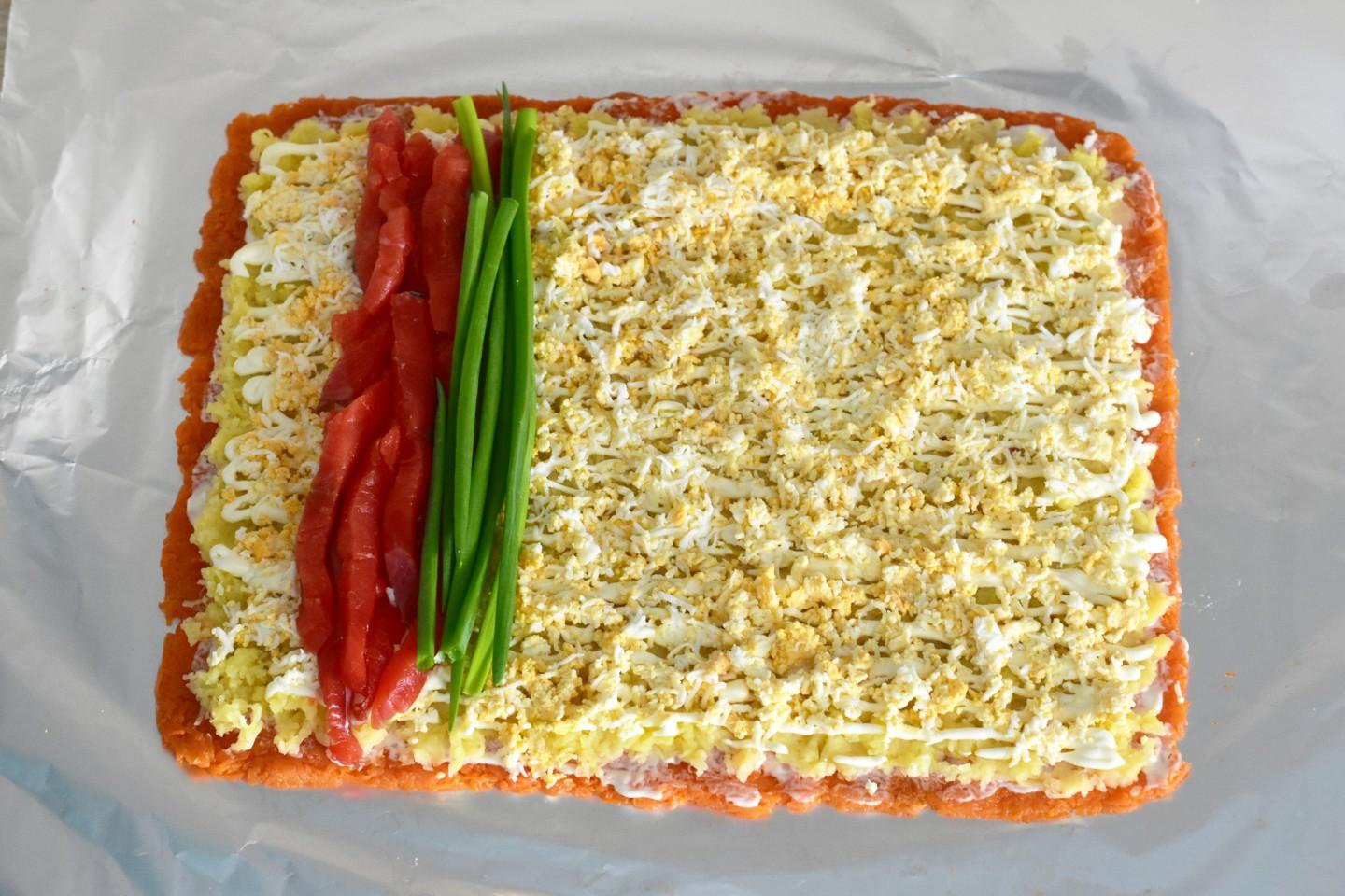 На большой лист плотной фольги или пищевой пленки выложите тертую морковь и придайте ей форму ровного прямоугольника. У меня размер прямоугольника 35×30 см. Смажьте морковь тонким слоем майонеза. Поверх равномерно распределите картофель и также смажьте его майонезом. Далее выложите тертые яйца и снова майонез.