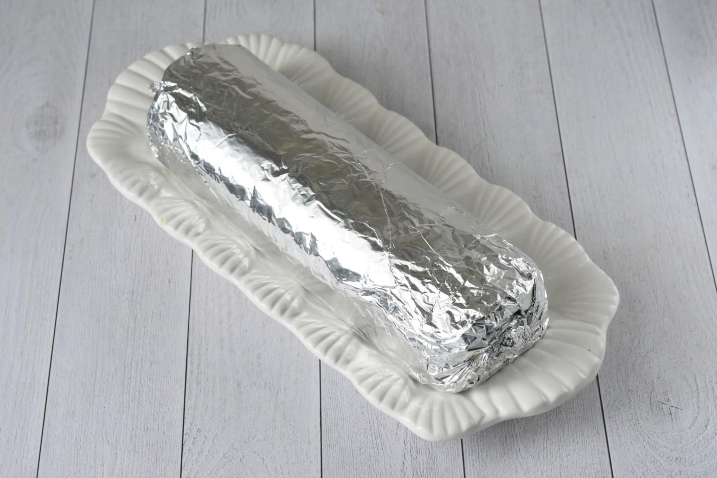 Поднимая края фольги, аккуратно сверните салат в плотный рулет. Края фольги по бокам закрутите, как конфету. Положите салат в холодильник примерно на6-8 часов для пропитки. Об особенностях использования фольги читайте в статье по ссылке в конце рецепта.