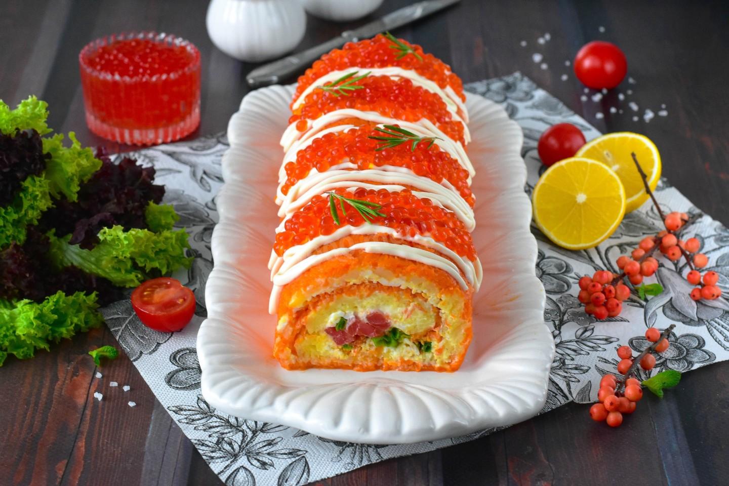 Охлажденный рулет осторожно разверните и переложите на блюдо. Закуску полейте майонезом из кондитерского мешка, украсьте на свой вкус красной икрой и зеленью и подайте к столу. Разделить салат на порции можно привычным способом, как обычный рулет. Приятного аппетита!