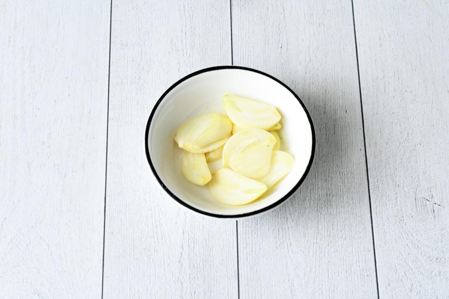 Чеснок очистите и нарежьте пластинками. Для этого положите головку чеснока на разделочную доску, боком, и сильно надавите на неё ладонью или ребром широкого ножа — оболочка треснет, и зубчики легко отделятся. Каждый зубчик очистите, поддев кожицу или снова слегка придавив плоской стороной ножа. Также можно сложить зубчики в металлическую миску, накрыть второй миской и энергично потрясти 20–30 секунд — зубчики очистятся от шелухи.