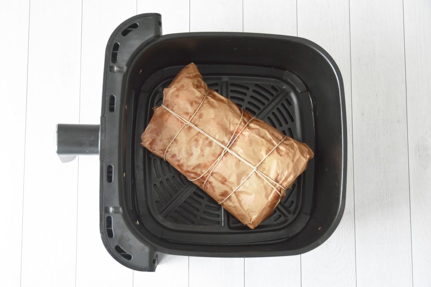 Не разворачивая пергамент, уложите карбонат в чашу аэрогриля на решетку. Запекайте при 180℃ около 1,5 часов. Сок у готового мяса должен быть прозрачный. Время запекания может отличаться в зависимости от особенностей аэрогриля. Подробнее - по ссылке ниже. Не разворачивая пергамент, охладите мясо при комнатной температуре. Затем уберите в холодильник на 5-6 часов. Выделившийся при запекании сок обратно впитается в мясо и сделает его сочнее.
