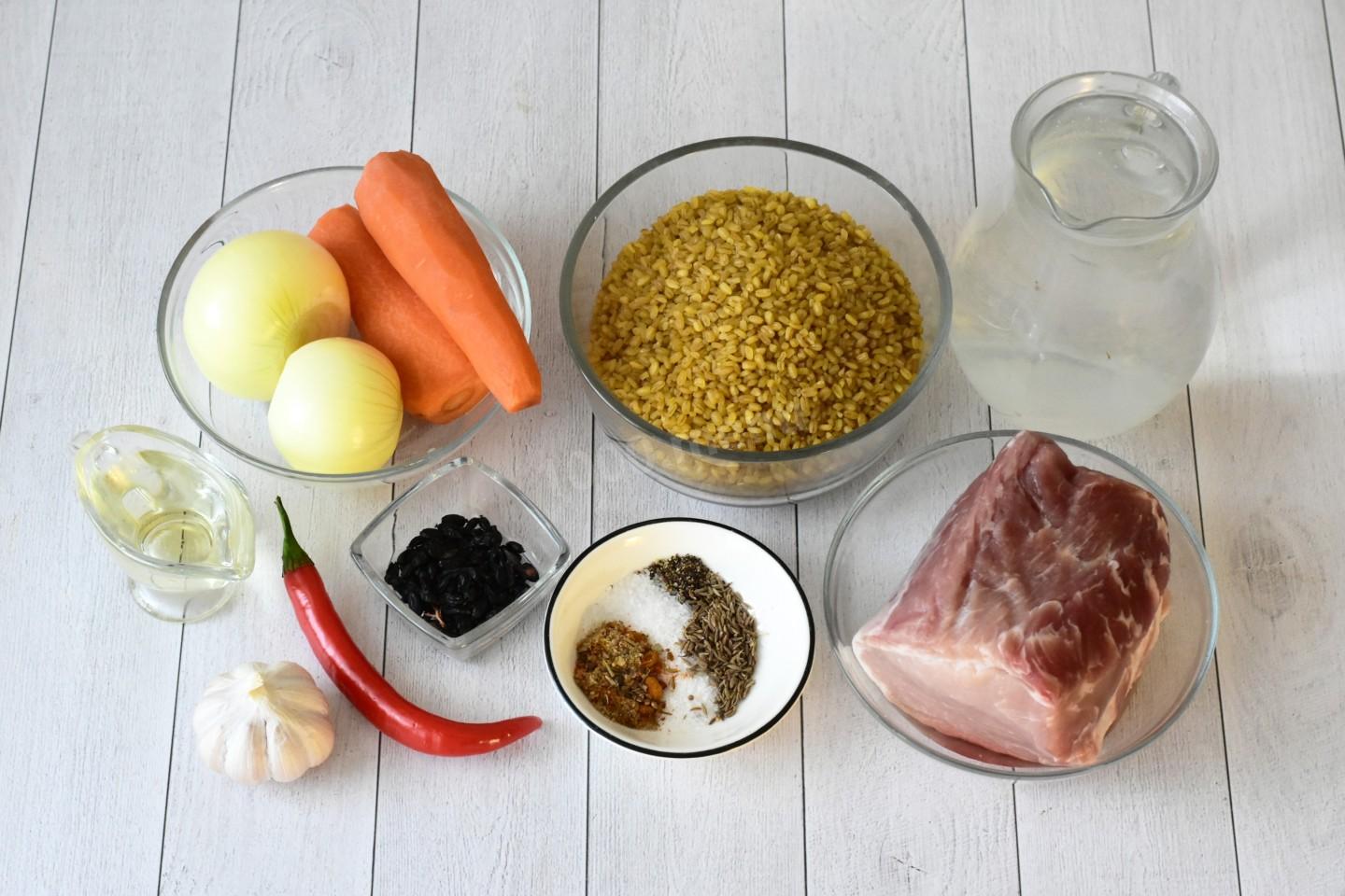 Подготовьте необходимые ингредиенты по списку. Плов можно готовить без барбариса, но я готовлю с этими ингредиентами - он придает блюду аромат и легкую приятную кислинку. Булгур можете заменить на рис, но учтите, что калорийность и время приготовления блюда могут измениться. Указанные специи можете заменять и дополнять по вкусу.