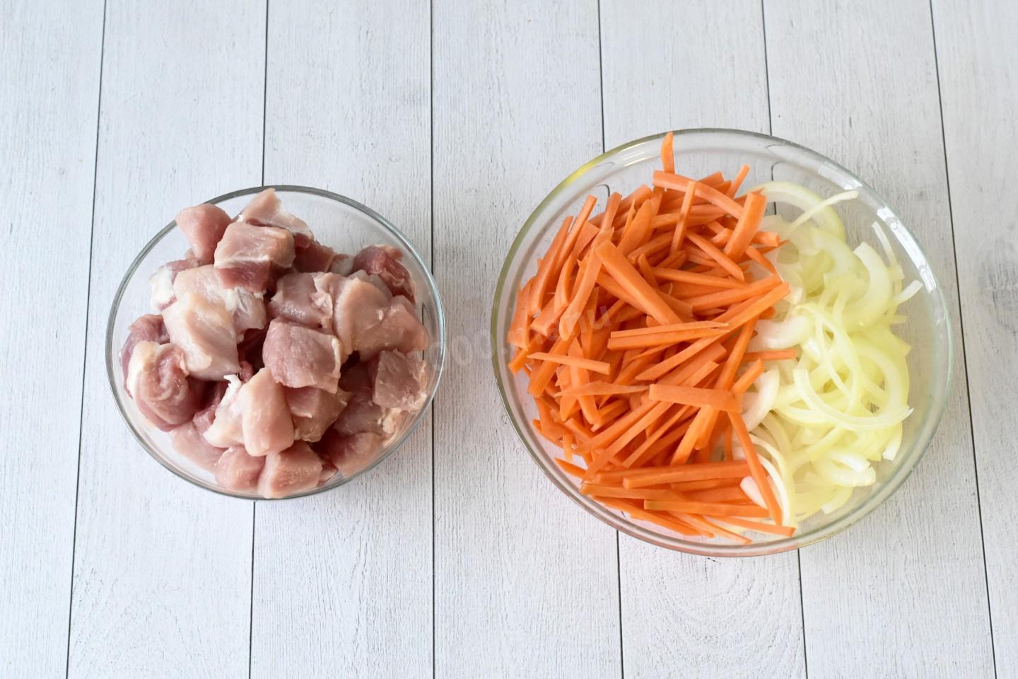 Мясо заранее разморозьте. Свинину нарежьте средними кусочками. Свинина нужна без кости, только мякоть. Это может быть лопатка, окорок, вырезка и т. д. Подробнее о выборе мяса и правильной разморозке читайте ниже. Морковь вымойте, очистите и нарежьте соломкой. Лук очистите и нарежьте полукольцами. Если не любите ощущать лук в готовом плове, можете нарезать его более крупно или вообще оставить луковицу целой, чтобы потом можно было легко ее убрать.