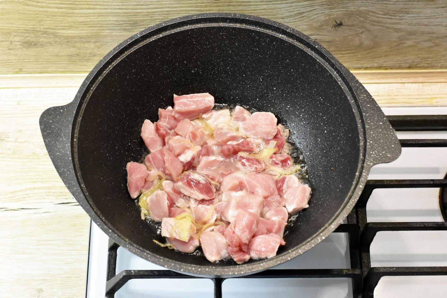 В казане или на толстостенной сковороде разогрейте растительное масло. Я готовлю в казане. Выложите лук и обжарьте до золотистого цвета. Добавьте в казан свинину и обжарьте на сильном огне, периодически помешивая, примерно 10-15 минут. О секретах приготовления вкусного плова, выборе подходящего масла для жарки и сковороды читайте в статьях на эти темы. Ссылки в конце рецепта.