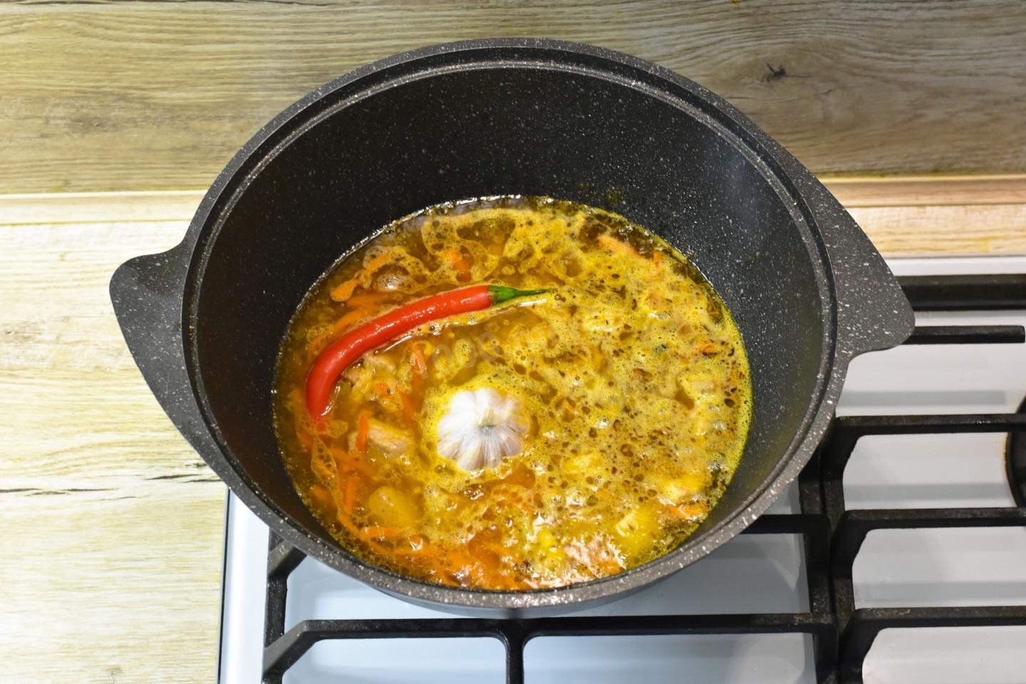 Добавление целой головки чеснока — классический прием в узбекском плове. Он не дает резкой остроты, а во время томления деликатно ароматизирует блюдо, становясь после приготовления мягким и сладковатым.