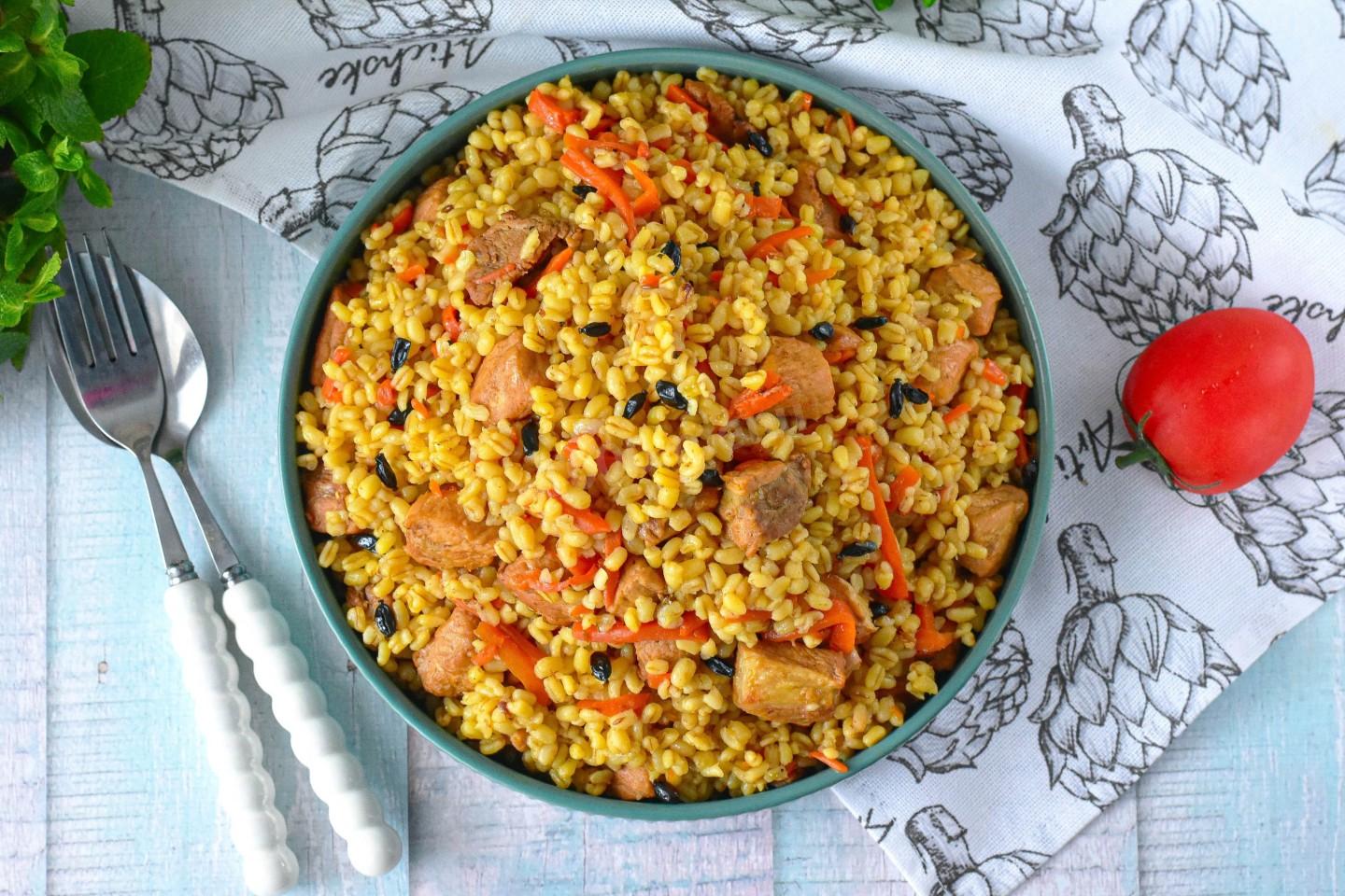 Булгур: Выбирайте среднезерный или крупный булгур — он лучше всего подходит для плова, не разварится и останется рассыпчатым.