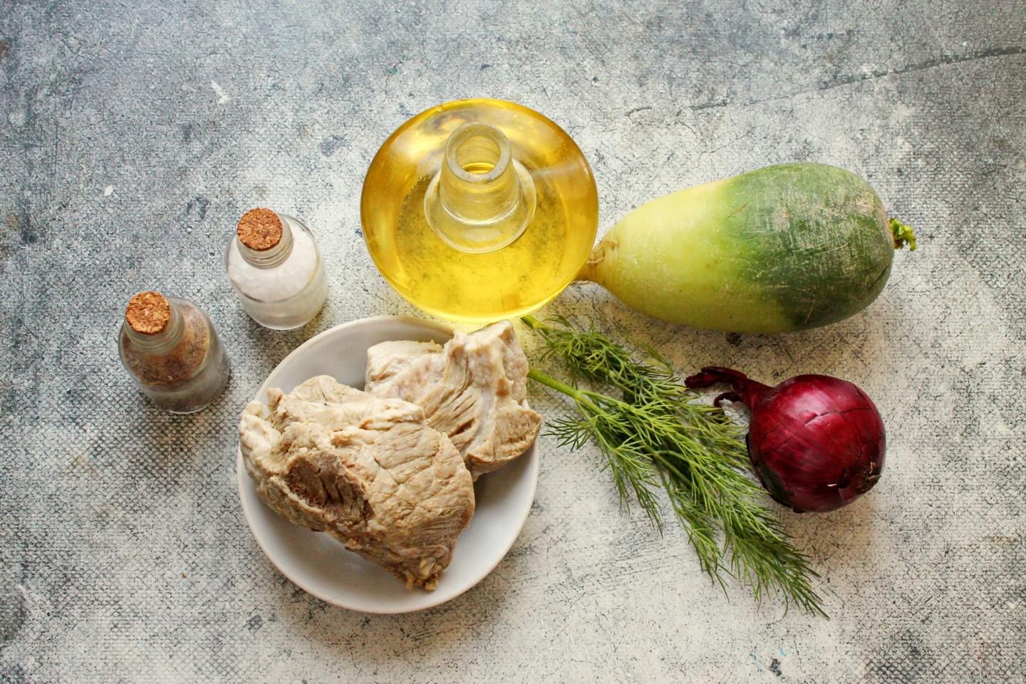 Подготовьте необходимые ингредиенты. Редьку тщательно вымойте под проточной водой с помощью щетки или жесткой мочалки. Редьку очистите от кожуры. Красный лук почистите и сполосните, зелень ополосните и отряхните от воды. Красный лук можете заменить на обычный репчатый. Мясо заранее разморозьте и отварите до готовности. О выборе кастрюли для варки и особенностях разморозки читайте по ссылкам ниже.