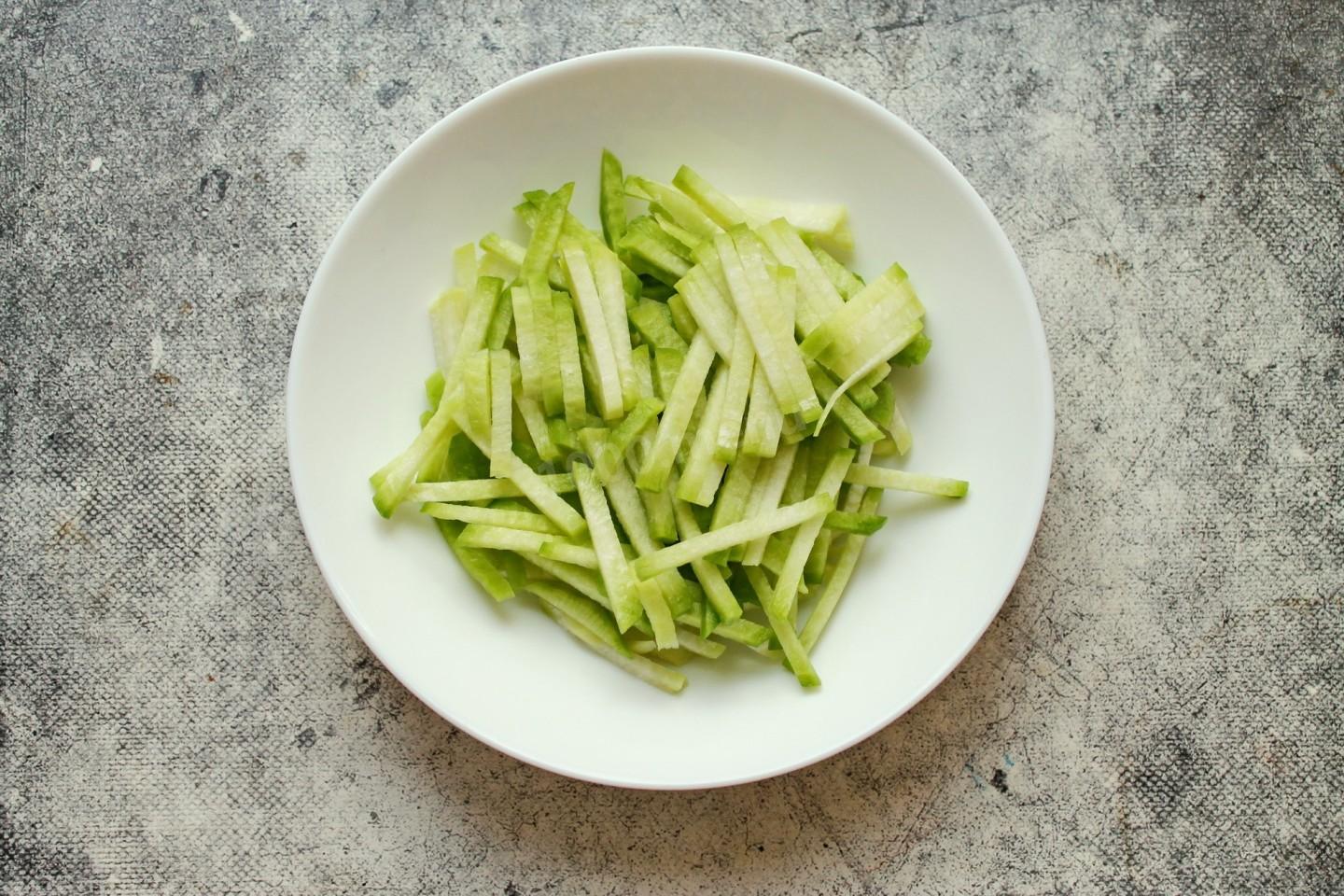 Зеленую редьку порежьте средней соломкой. Для салата можно взять редьку любого сорта, но лучше всего подойдет зеленая, белая или розовая редька. По этому же принципу можно сделать салат с крупным редисом.