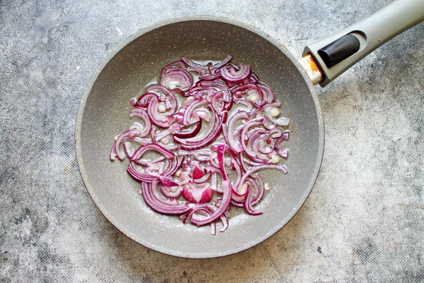 Лук: Красный лук предпочтительнее из-за его более сладкого вкуса и мягкости после жарки.