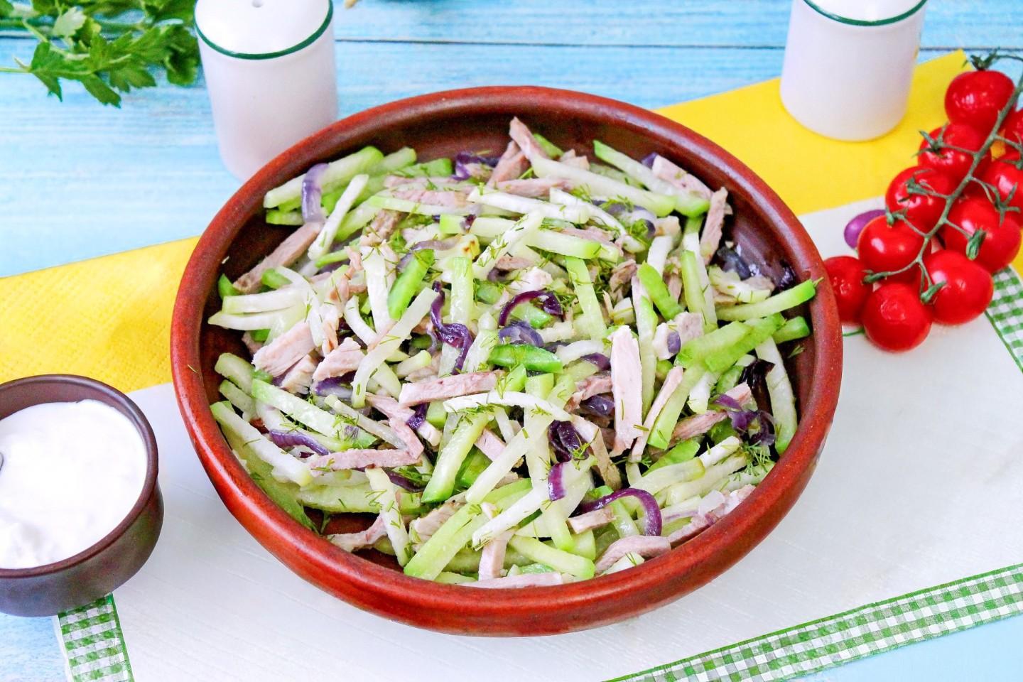 Отварное мясо, у меня свинина, но можно взять любое, например, говядину, филе курицы или идейки, порежьте средней соломкой и выложите к овощам. Все посолите, поперчите по вкусу и перемешайте. При желании его можно заправить сметаной, густым йогуртом или майонезом. Рецепты домашнего майонеза найдете по ссылке под шагами.