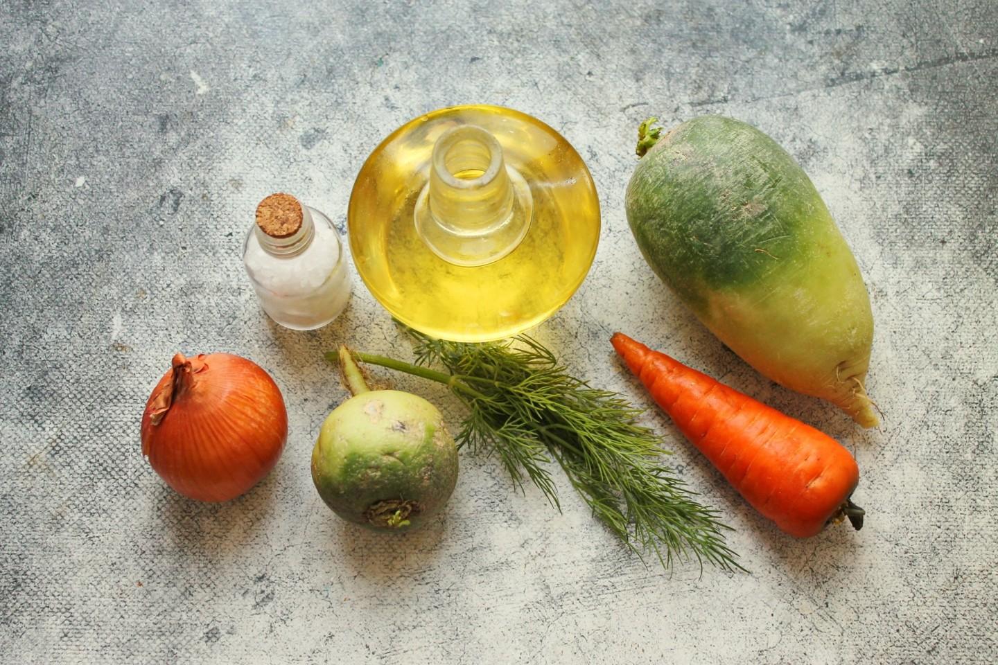 Подготовьте все необходимые ингредиенты для приготовления. Редьку и морковь тщательно вымойте под проточной водой с помощью щетки или жесткой мочалки, очистите от кожуры и ополосните. Лук можете использовать любой. Очистите лук и вымойте. Зелень сполосните и отряхните от воды.