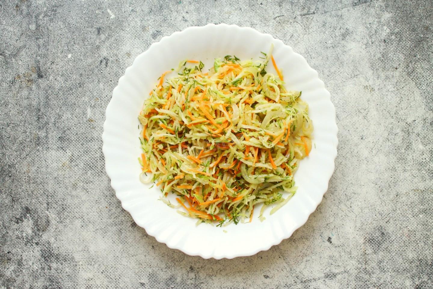 Пока остывает обжаренный репчатый лук, подготовьте остальные овощи. Зеленую редьку и морковь натрите на терке для корейской моркови или нарежьте ножом на очень тонкие полоски. О видах терок и способах работы с ними читайте в статье после рецепта. Подготовленные овощи положите в салатник, посолите. Если редька очень острая, сполосните ее в холодной воде и откиньте на сито, чтобы жидкость полностью стекла.