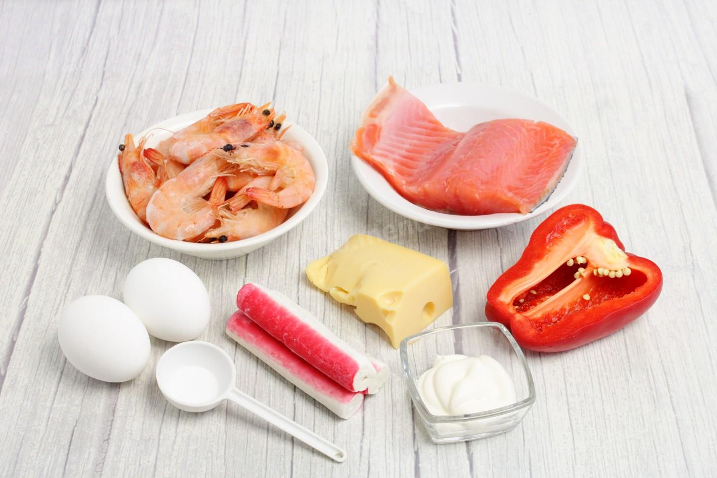 Подготовьте продукты по списку. Креветки можно использовать любого вида и размера. Рыбу можно взять любую красную слабосоленую или копченую, у меня слабосоленая форель, подойдет также семга, горбуша, кета, лосось. Сыр можно взять любой: твердый или полутвердый. Главное, чтобы он был вкусным, без заменителей молочных жиров. Крабовые палочки можно заменить крабовым мясом. Как правильно покупать эти продукты, читайте после шагов.