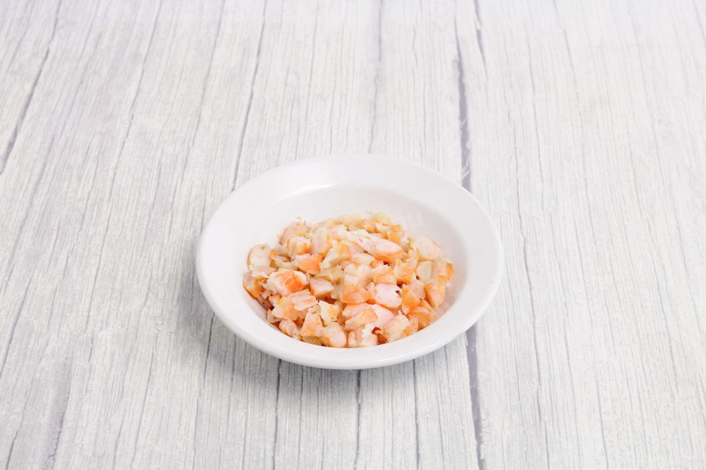 Креветки сварите в кипящей подсоленной воде. Время варки будет зависеть от размера креветок. Мелкие креветки варите около 1-2 минут, средние - 3-4 минуты, королевские – 5 минут, тигровые – 6-7 минут после закипания воды. После варки переложите креветки в емкость с ледяной водой на 1-2 минуты, чтобы остановить процесс приготовления. Креветки очистите, нарежьте некрупными кусочками. Как правильно сварить креветки и выбрать кастрюлю, читайте ниже.