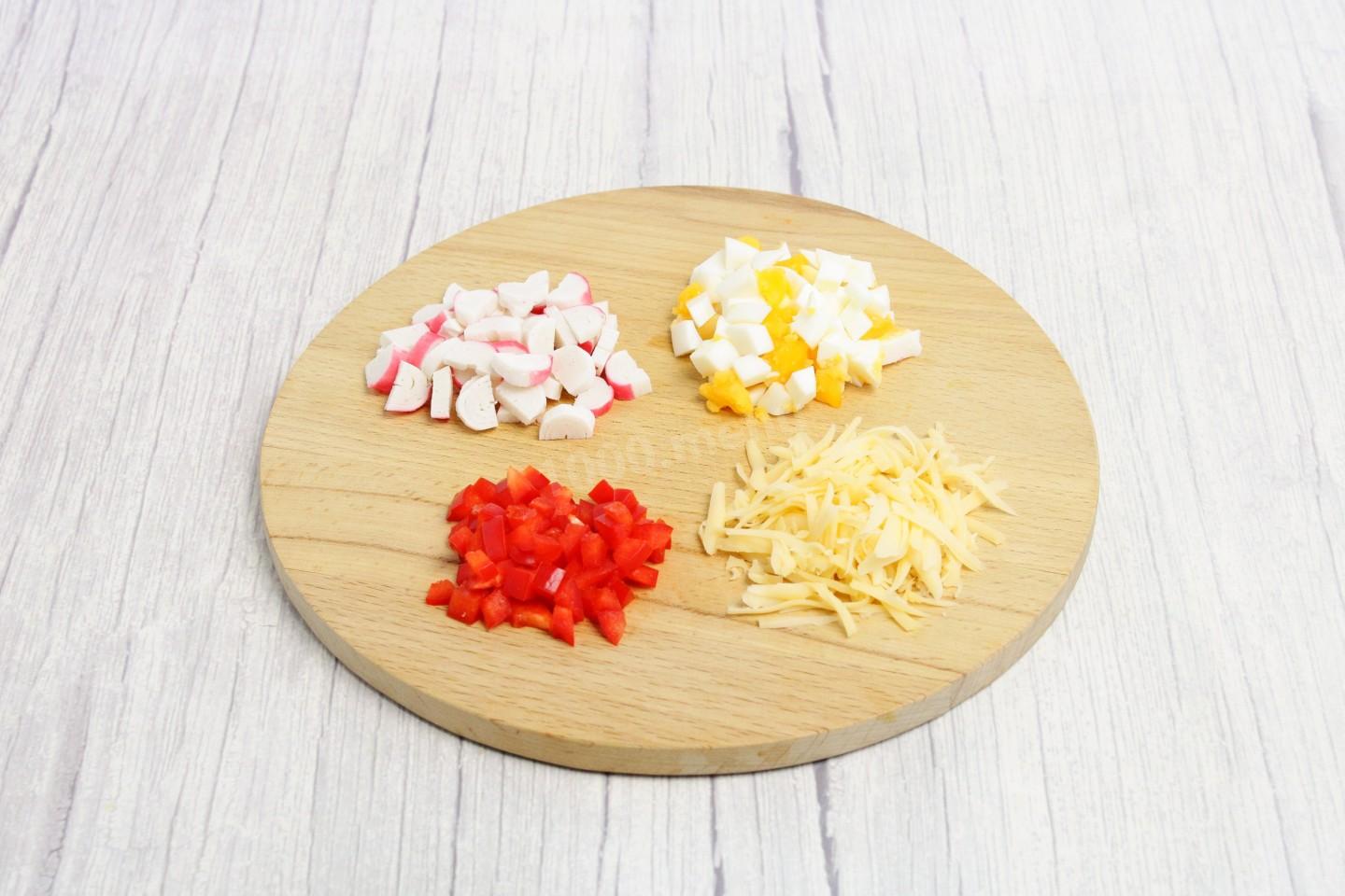 Яйца вымойте и сварите вкрутую.. Как выбрать и правильно сварить яйца, читайте в статье по ссылке в конце рецепта. Яйца охладите, очистите, нарежьте мелкими кубиками. Немного белка оставьте для украшения салата. Болгарский перец вымойте, обсушите, удалите семена и зеленую часть. Нарежьте овощ мелкими кубиками. Крабовые палочки так же некрупно нарежьте. Сыр натрите на крупной терке. Часть сыра оставьте для оформления верха салата.