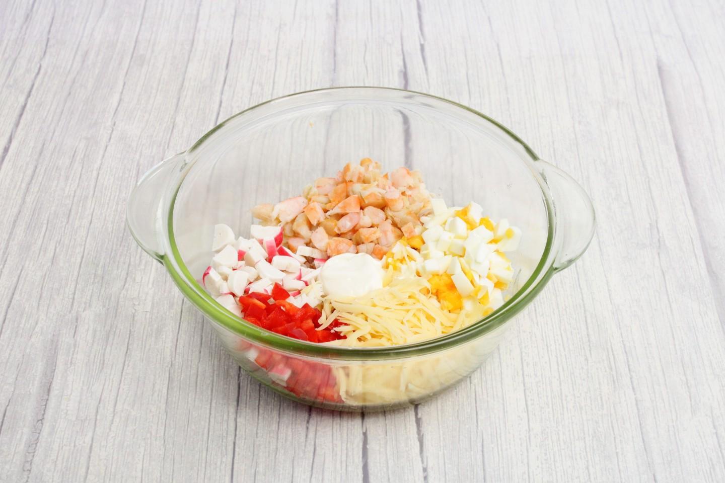 В миске соедините подготовленные ингредиенты: крабовые палочки, креветки, яйца, болгарский перец и сыр. Добавьте майонез по вкусу и перемешайте. Так же в качестве заправки можно использовать сметану или натуральный йогурт. Их можно взять по отдельности либо смешать с майонезом в любой пропорции на свой вкус. Майонез можно сделать самим. Рецепты домашнего майонеза представлены в конце рецепта.