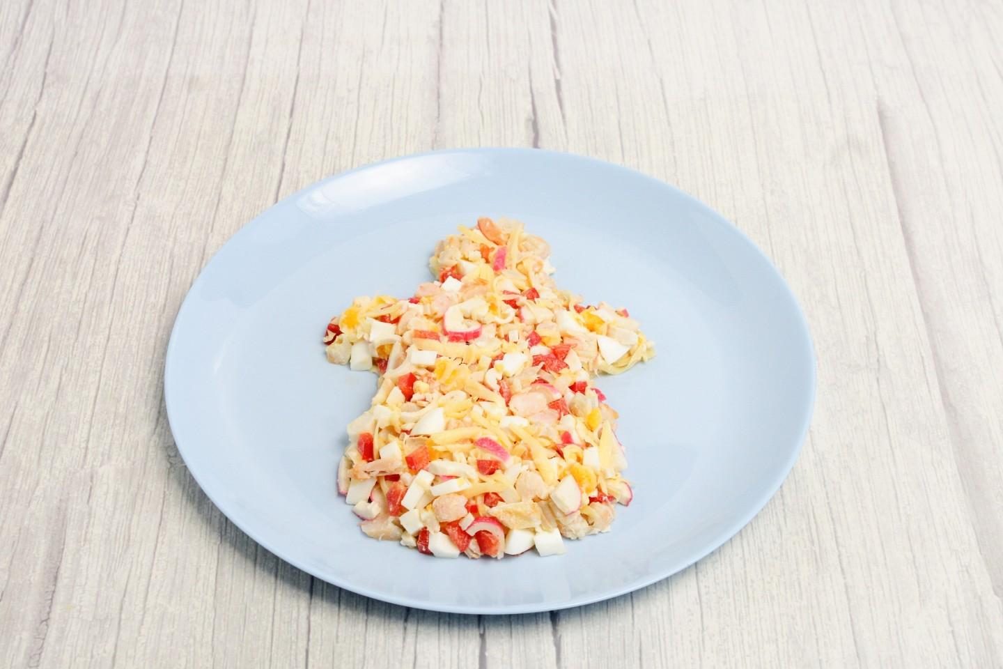 Собранный и украшенный салат нужно подавать сразу. Если необходимо сделать заранее, подготовьте все ингредиенты, смешайте основу и храните в миске под пленкой в холодильнике. Украшения (нарезанную рыбу, тертый сыр, перец) храните отдельно. Соберите фигурку за 30-40 минут до подачи.