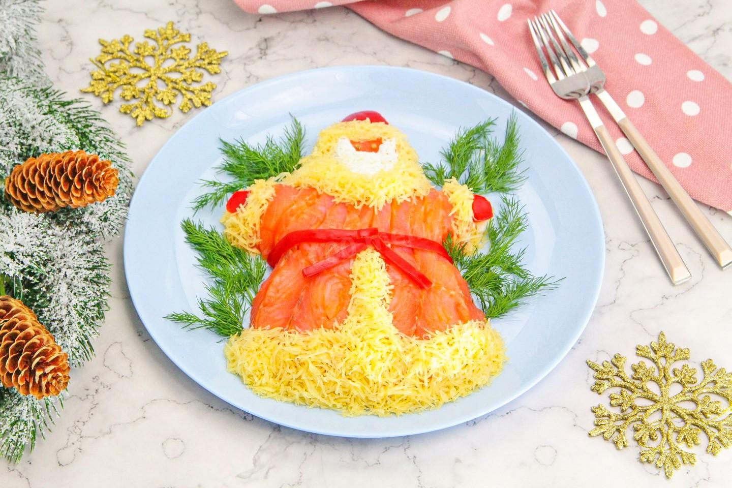 Украшайте салат от общего к частному: сначала выложите основную форму, затем «шубу» из рыбы, потом бороду из белка, и в самом конце мелкие детали (глаза, пояс, помпон).
