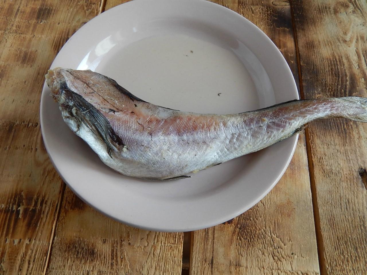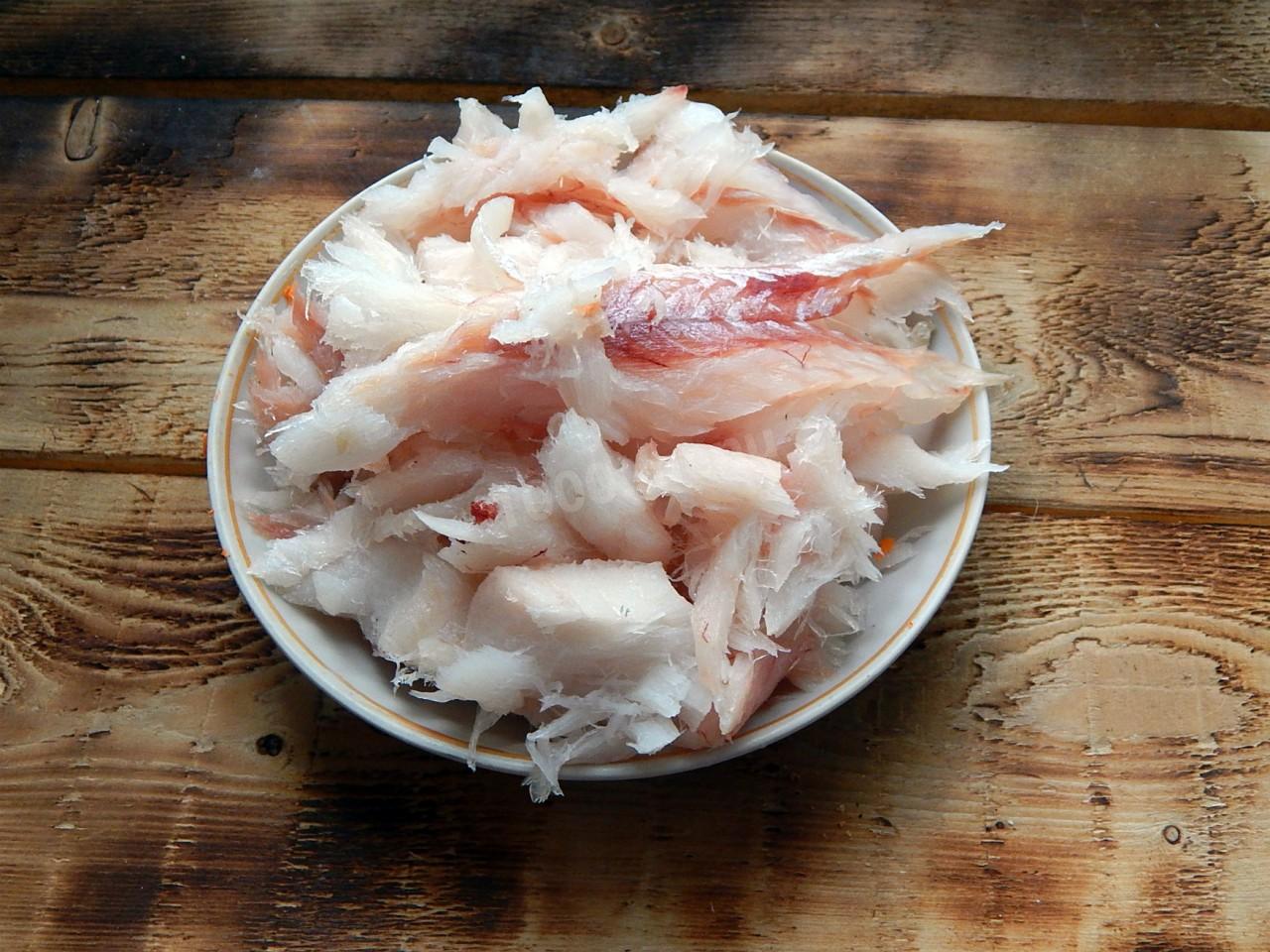Рыбу очистите, выпотрошите и отворите в подсоленной воде с лавровым листом и перцем горошком в течение 20 минут. Рыбу остудите, мякоть отделите от костей и разделайте на небольшие кусочки.