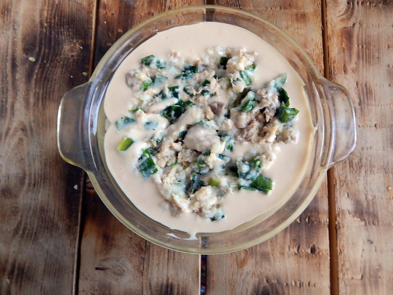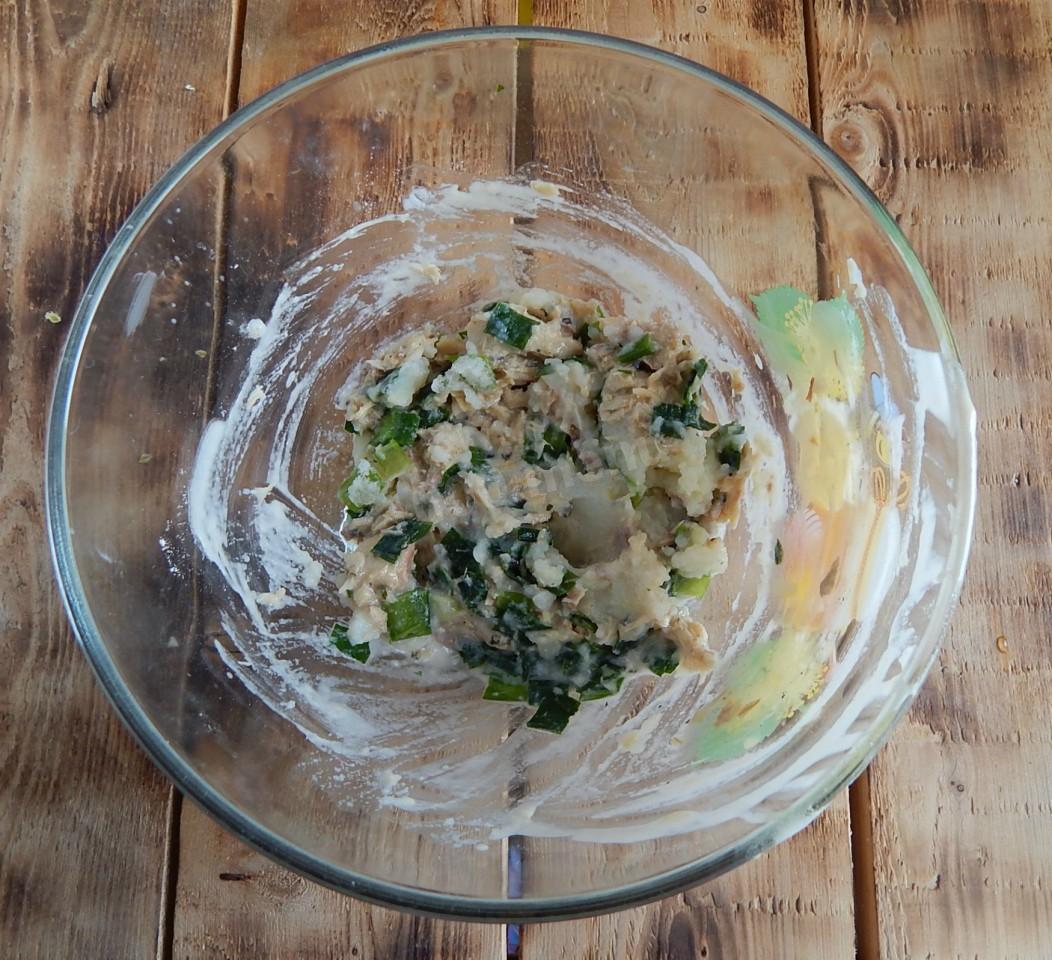 Очень простое и быстрое в приготовлении тесто. Всё просто смешивается и получается однородное тесто по консистенции, как густая сметана. Ну а с начинкой не пришлось долго возиться, рыбу нарезала кубиками, измельчённый лук репчатый пассеровала до полупрозрачности. Рыбу не стала доводить до готовности, а лишь слегка прогрела, чтобы начинка была более сочная.