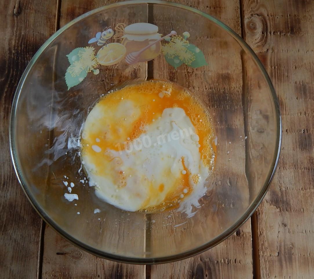Подготовьте ингредиенты для теста. Кефир заранее выньте из холодильника, он должен быть комнатной температуры. Заранее включите духовку на 180 градусов. В миску вбейте яйца и добавьте соль. Венчиком или миксером взбейте ингредиенты до получения однородной по консистенции смеси. Влейте кефир комнатной температуры и перемешайте.