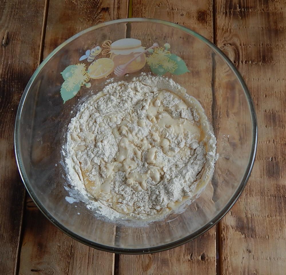 Всыпьте просеянную пшеничную муку. Замесите тесто, по консистенции похожее на густую сметану. Муки может понадобиться немного меньше или больше, смотрите а консистенции. О свойствах муки читайте в отдельной статье под шагами.