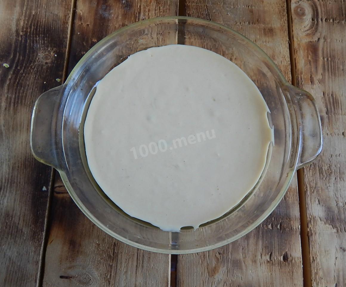 Форму для выпекания пирога смажьте растительным маслом и присыпьте мукой. Вылейте в форму 2/3 теста. Как выбрать форму для запекания читайте в отдельной статье по ссылке в конце рецепта.